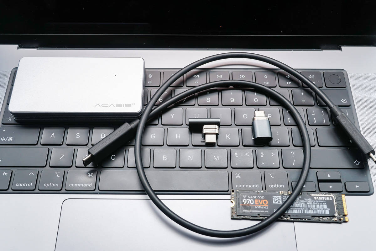 Keyinchalik, ma'lumotlarni uzatish testini ko'rib chiqaylik. Amaldagi asboblar Samsung 970 EVO qattiq diski, Thunderbolt 3 qattiq disk qutisi, Thunderbolt 3 ma'lumot kabeli va ikkita adapterdir.