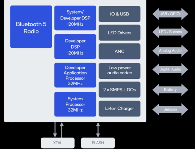Qualcomm QCC5124 chip-chip tizimi (SoC) kichik qurilmalarning mustahkam, yuqori sifatli, simsiz Bluetooth tinglash tajribasiga bo‘lgan ehtiyojlarini qondirish uchun mo‘ljallangan, audioni uzoqroq ijro etish uchun kam quvvat sarfi bilan. QCC5124 arxitekturasi kam quvvat iste'moli bilan yuqori ishlash uchun mo'ljallangan. Oldingi texnologiya bilan solishtirganda, quvvat sarfini 65 foizgacha kamaytirish mumkin, bu deyarli barcha ish rejimlarida audioni uzoqroq tinglash imkonini beradi.
